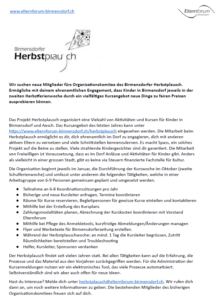 Schreibe uns direkt unter herbstplausch@elternforum-birmensdorf.ch . Wir freuen uns!